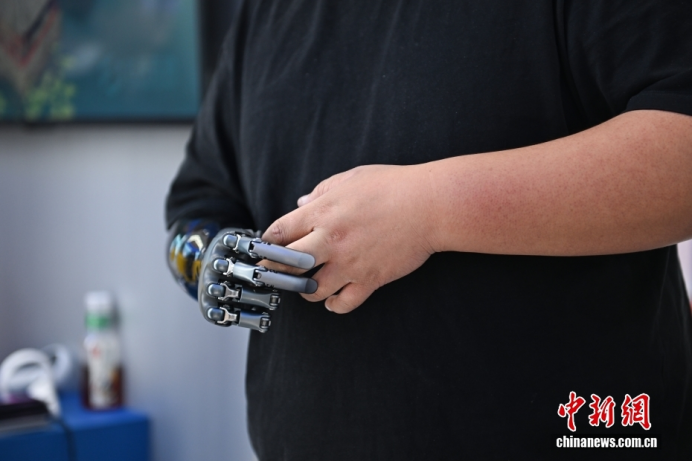 图为强脑科技工作人员佩戴的智能仿生手。中新网记者 李骏 摄